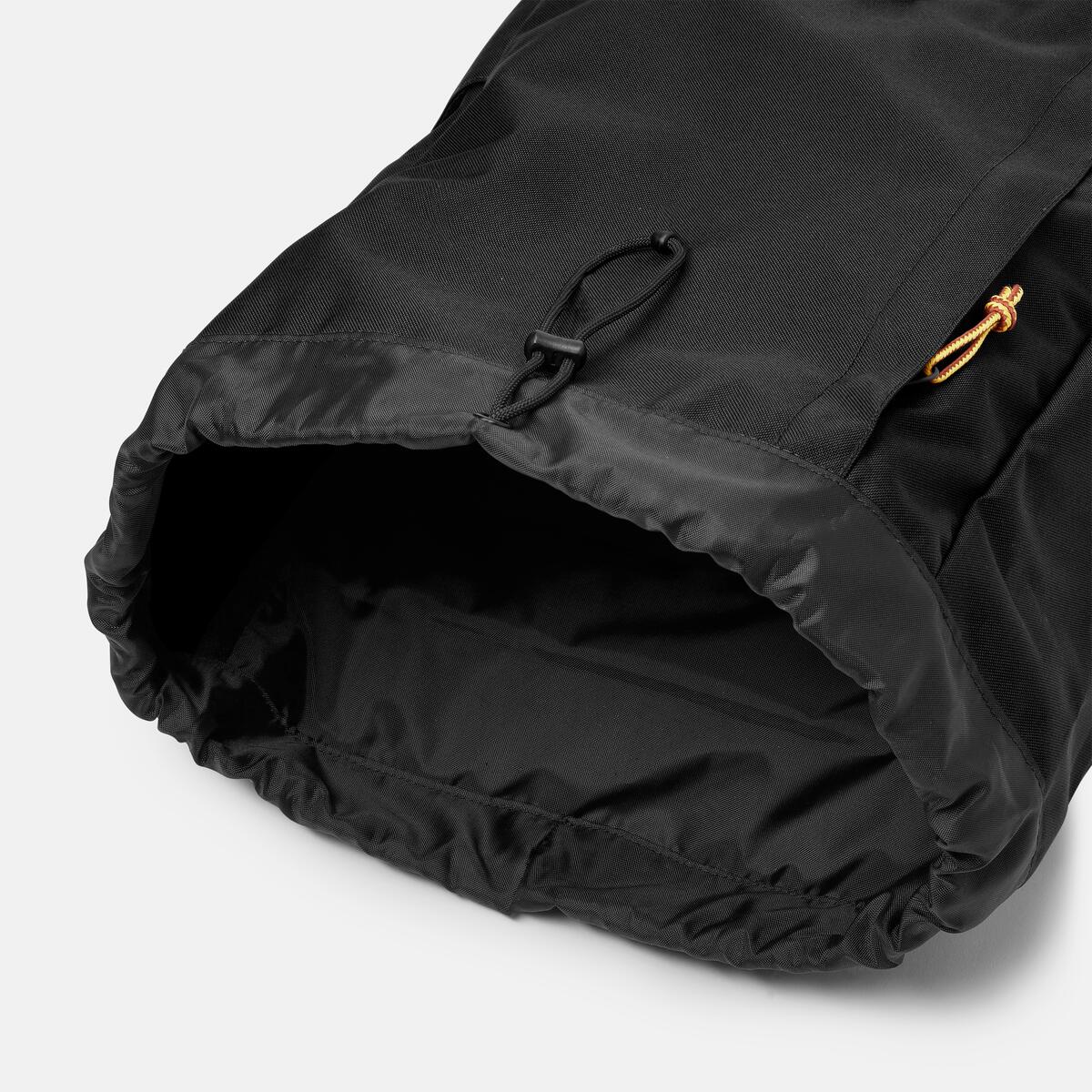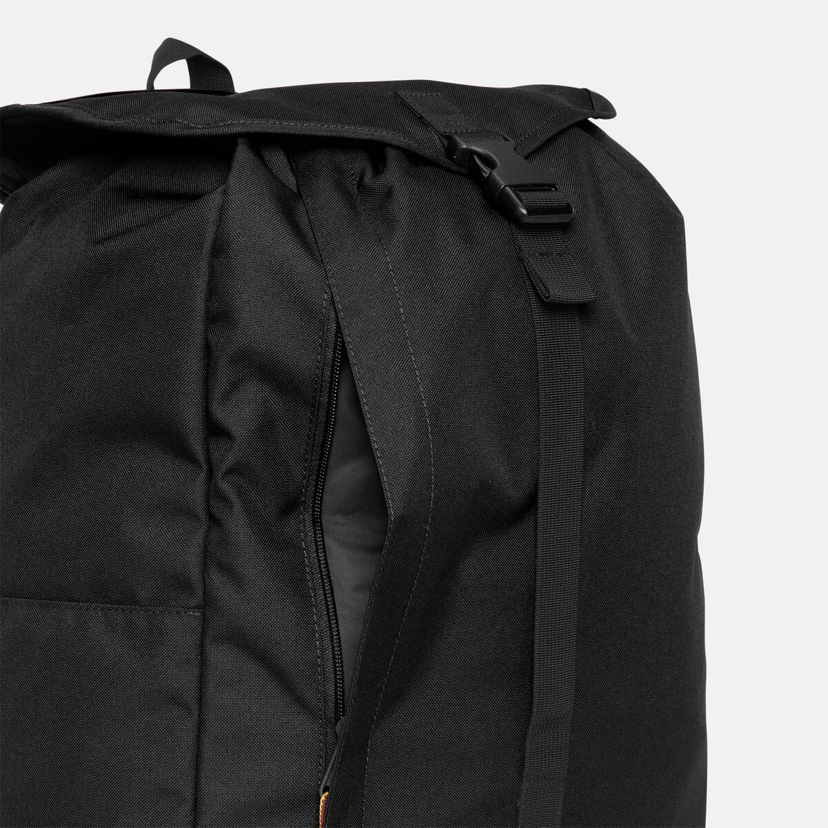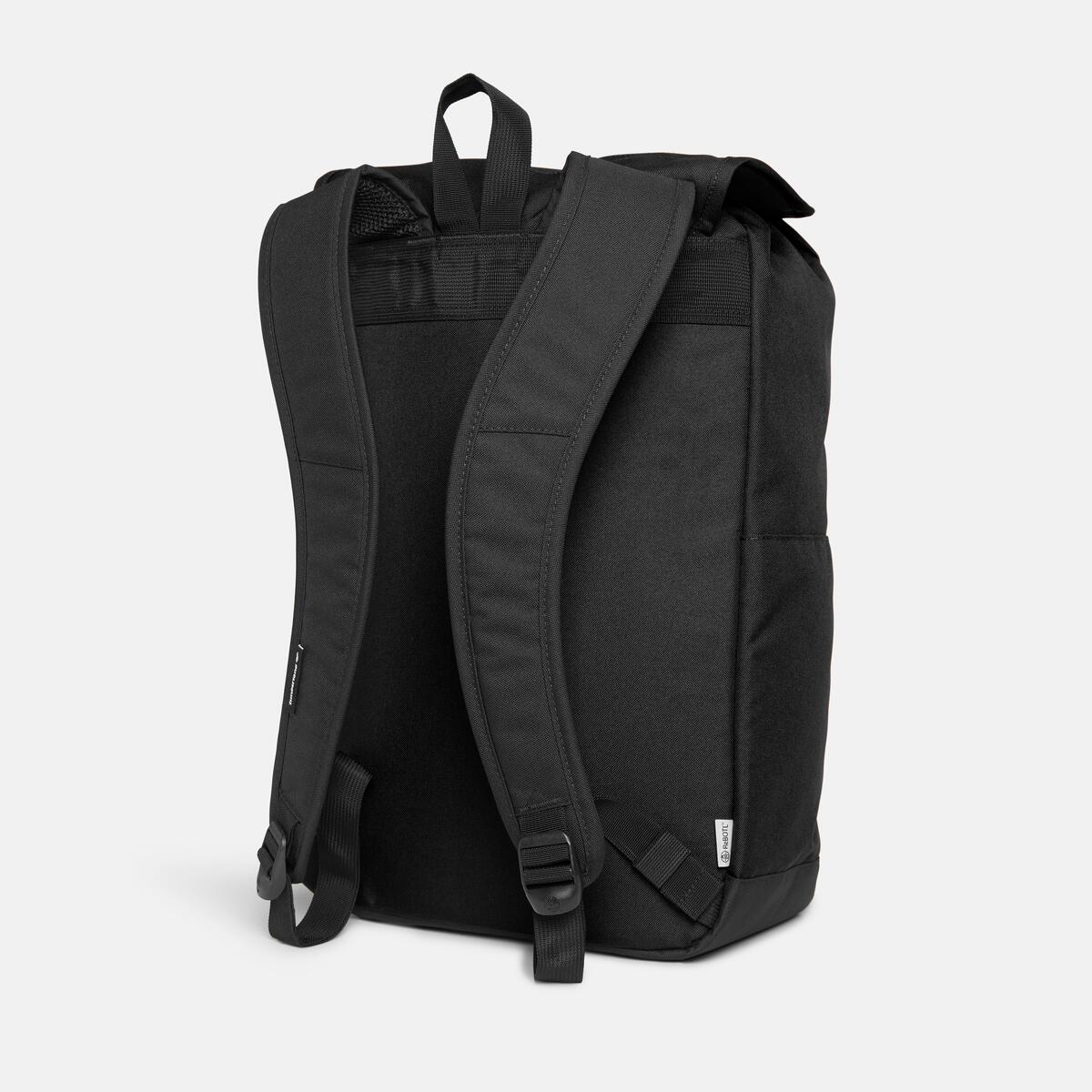 Our Heritage Backpack is made with a 100% recycled polyester shell and lining. It has a 19-liter capacity, a drawcord closure and flap with snap buttons and sliders, a padded internal laptop sleeve, several pockets, and ergonomic air mesh shoulder straps.