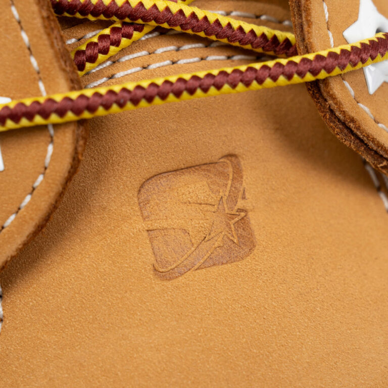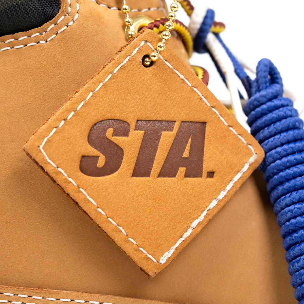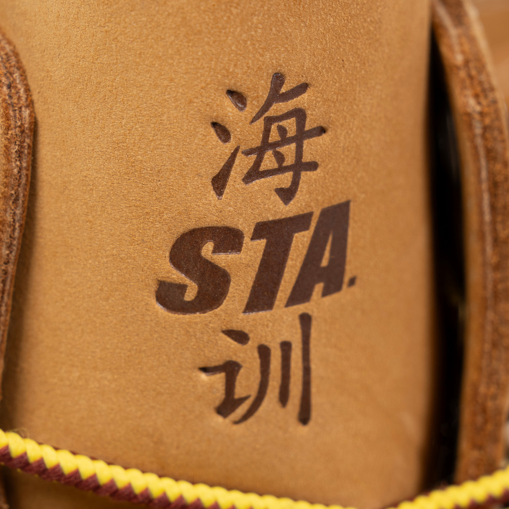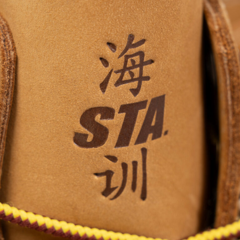 The boot draws inspiration from the spirit of adventure and freedom. The tongue features an embossed “海訓” emblem, celebrating the relentless courage of sailors. The boot collar incorporates STA’s classic camouflage pattern—Dai Zong Jungle Camo—along with the “”Double Swallows”” motif, symbolizing freedom and wildness, seamlessly blending Eastern imagery into a streetwear context. A striking blue STA GROUP woven label appears on the side, reminiscent of signal flags used at sea and enhancing the boot’s street-ready identity. Additionally, custom star-shaped perforations adorn the upper—symbolizing the idea of “journeying under the stars”—adding both visual impact and deeper metaphorical meaning.