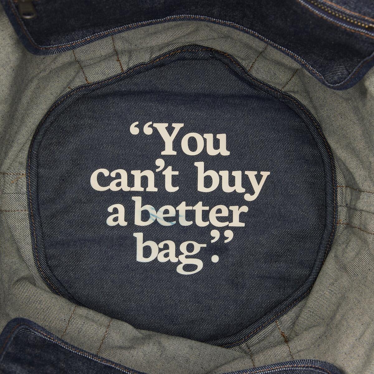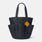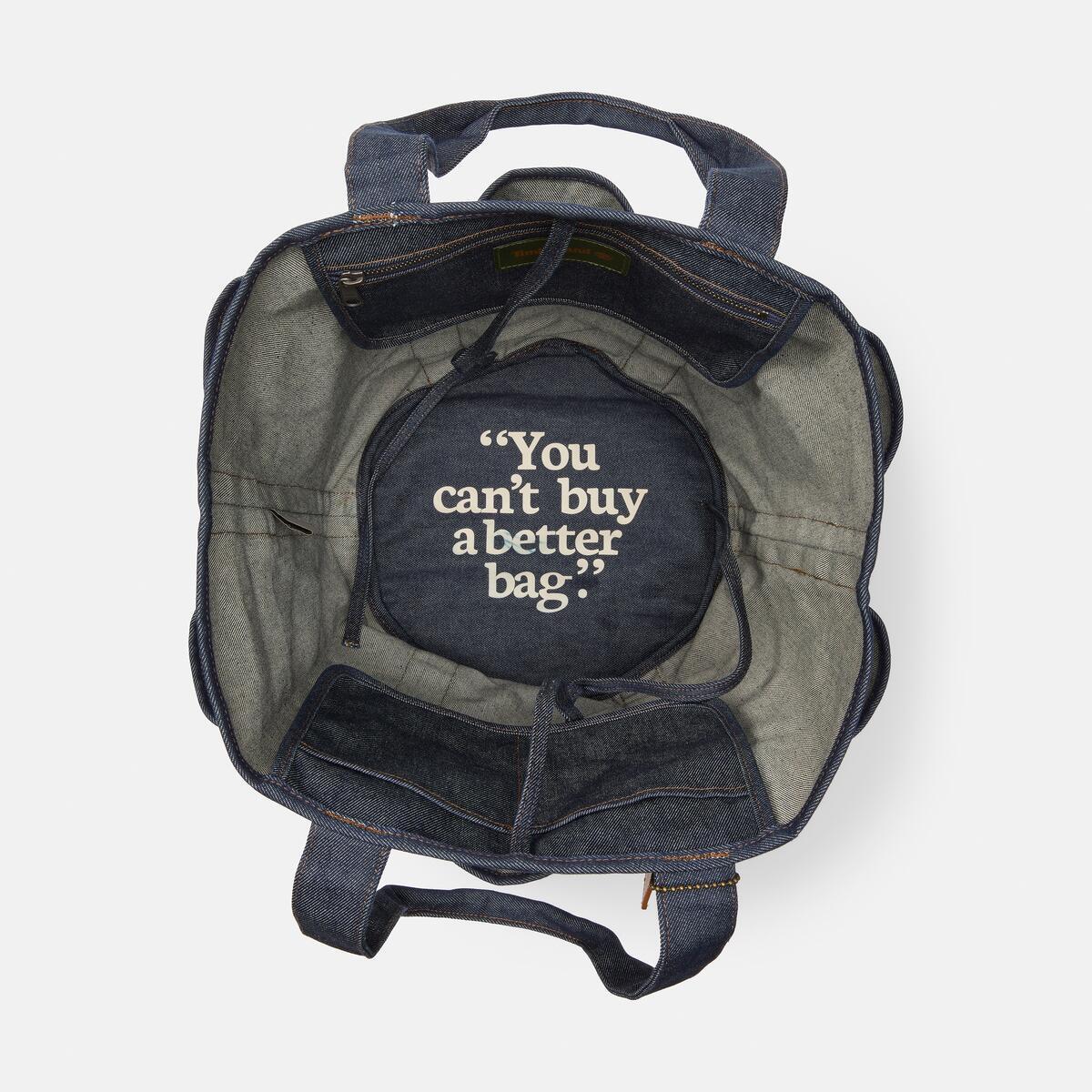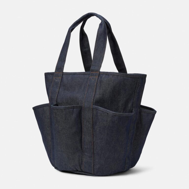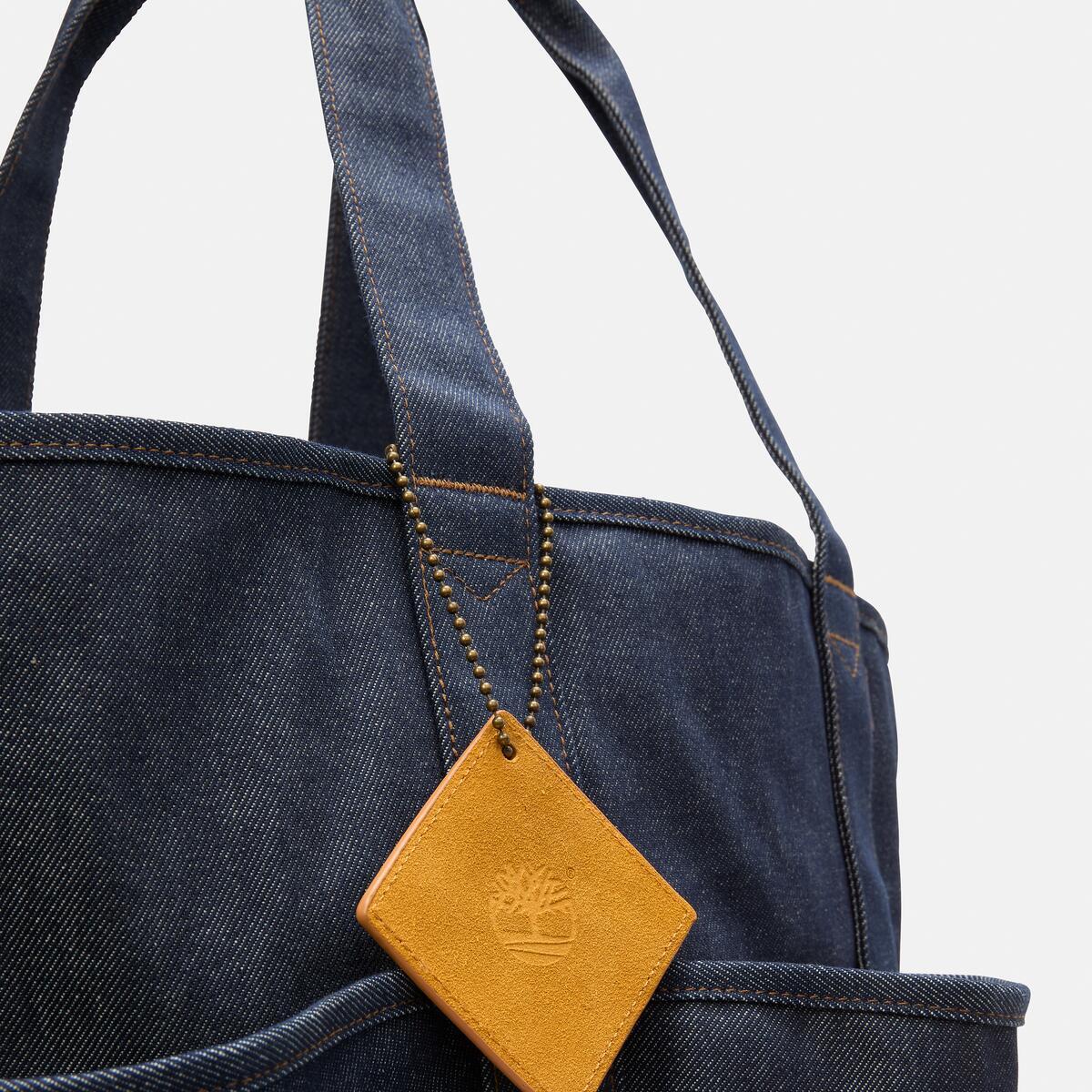 這款牛仔托特包設計考慮了收納空間、功能性與簡約外型。採用帶有束帶的開合主袋設計,具備內部拉鍊口袋、雙插袋、外部多功能口袋,以及帶有壓印大樹 LOGO 的菱形皮革標籤。